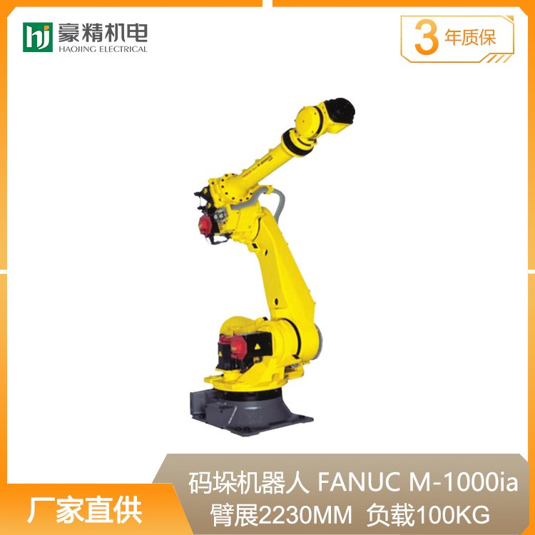 FANUC palletizing robot, automatic palletizing robot, brand FANUC, model M-1000ia/80F/100F/130F, 6 axes, load capacity 80-130kg, arm span 2230/3738mm, accuracy 0.1mm, applications: logistics handling, machine tool loading and unloading, palletizing, material processing, assembly, spot welding, arc welding, picking and packaging. Shanghai Haojing Robotics, relying on advanced technology and meticulous service, is committed to project integration applications and flexible manufacturing engineering solutions. We customize welding robot workstations and automated production lines according to your product requirements.