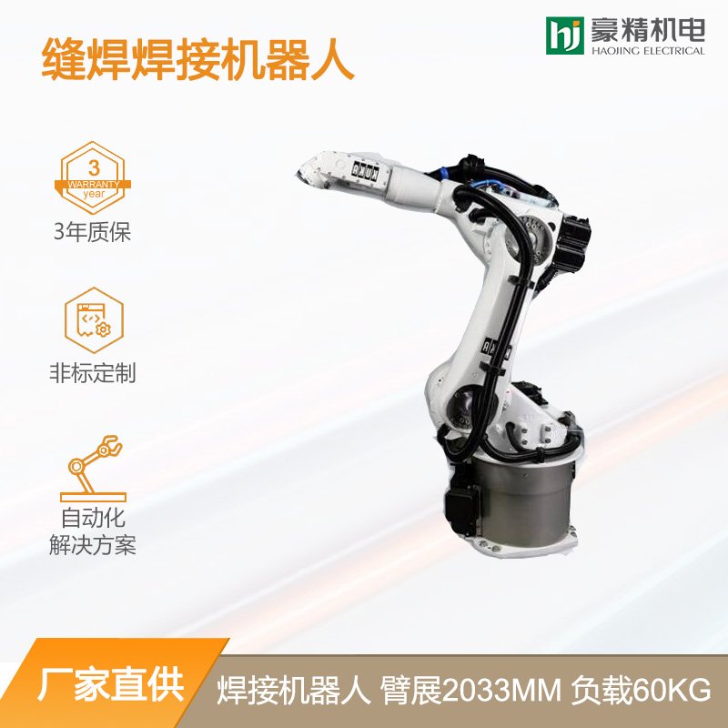 Seam welding robot, three-axis welding robot, brand Kuka, model KR 60, 3 axes, 60kg load capacity, 2033mm reach, 0.06mm precision. Applications: loading and unloading, material handling, assembly, adhesive application and sealing. Shanghai Haojing Robotics, relying on advanced technology and meticulous service, is committed to project integration and flexible manufacturing engineering solutions. We customize positioners, fixtures, welding robot workstations, and automated production lines according to your product requirements.