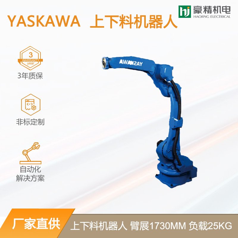 Gantry loading/unloading robot, automatic loading/unloading robot, brand YASKAWA, model GP25, 6 axes, 25kg load capacity, 1730mm reach, 0.02mm precision, application: material handling. Shanghai Haojing Robotics, relying on advanced technology and meticulous service, is committed to project integration and application, flexible manufacturing engineering solutions, and customizing welding robot workstations and automated production lines according to your product requirements.